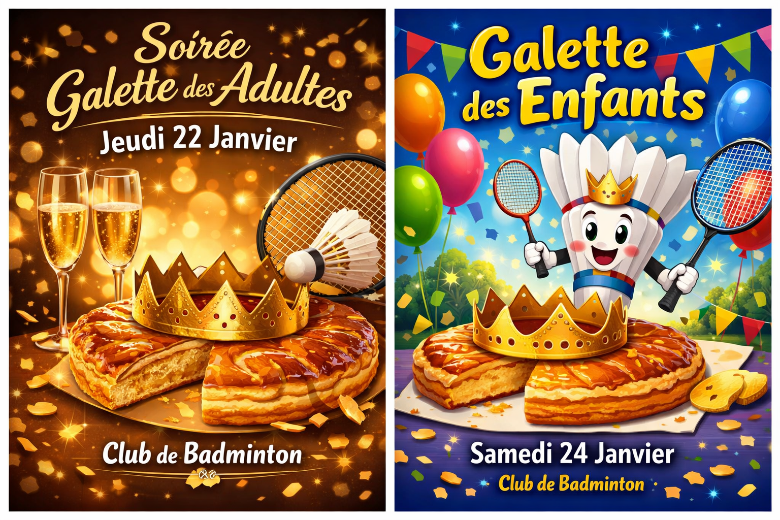 La galette sera servie à l'issue de l’entraînement du jeudi 22 janvier. Un moment convivial pour bien terminer le tournoi de convivialité prévu ce soir-là et, qui sait, couronner quelques rois et reines du badminton !
